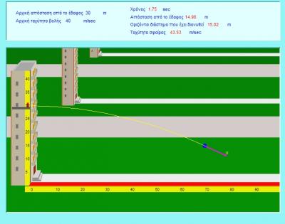 Ταυτόχρονα με την κίνηση του σώματος δείχνονται οι τιμές του χρόνου κίνησης του, της ταχύτητας, της οριζόντιας απόστασης που έχει διανύσει και της απόστασης από το έδαφος.